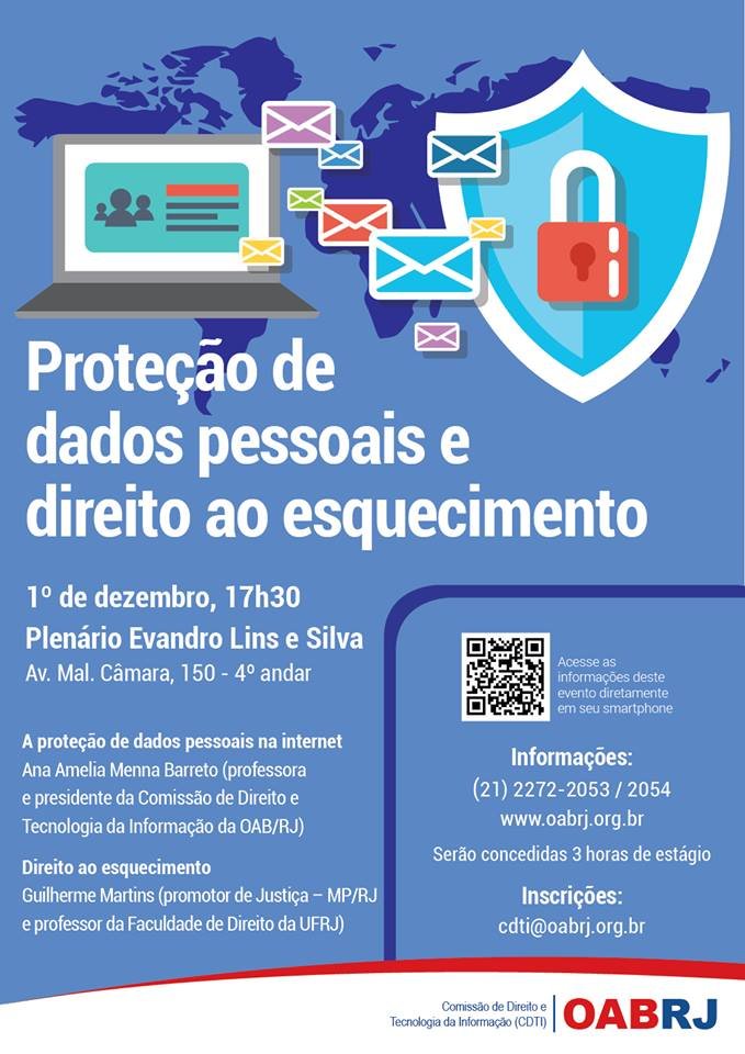 Evento na OAB/RJ em 2015 Palestra de Ana Amelia Menna Barreto – A proteção de dados pessoais e direito ao esquecimento Palestra